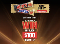 The Mars & Snickers Find the Gold Bar Consumer 2025 Promotion offers a total prize pool of up to AUD $450,000. Ten major prizes of AUD $10,000 cash each are available in Australia and ten in New Zealand. Additionally, there are 2,500 instant win prizes of AUD $100 each across both countries.
